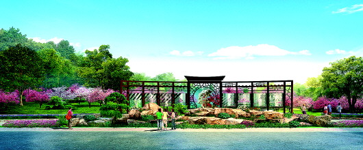 [公园西景入口]包括以金属材质为主,以春花剪纸图案漏窗为辅的中式景墙和景观虚实结合的花池及山体春花植物,提升世纪西路景观水平。