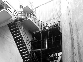 连接两台350万瓦机组的主烟囱,已被封上了“禁止入内”的提示,烟囱里有工作人员正在进行24小时不间断施工。烟囱之外,还有几位工作人员正往烟囱内输砂除锈。