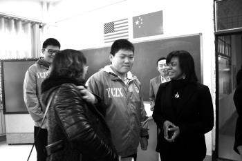 27日,育才中学“2014级国际班开班典礼暨施强国际合作交流单位出国留学人才教育基地”正式揭牌。此次开班的2014级国际班实行双班主任制,文化课班主任主要负责国内学业水平科目的学习,英语班主任主要负责国际课程的管理。图为施强国际培训学校副校长Tina和国际班的学生交流。