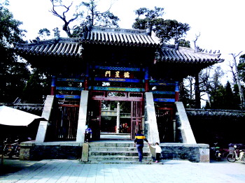 ◥孟庙棂星门前,一对母子准备进入参观(资料图)。