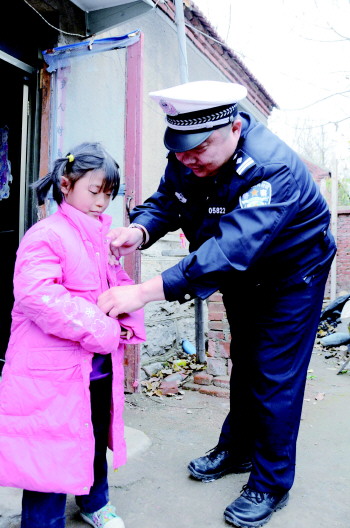 26日上午,邹城市公安局交警大队五中队民警赵波将新买的羽绒服给小李欣穿上。