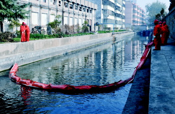 抢修队员布放围油栏,拦截假想泄漏“原油”。