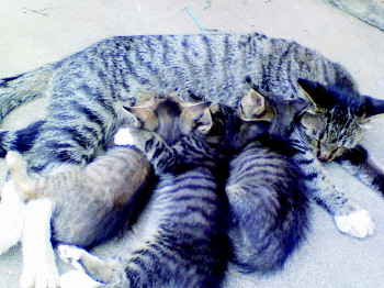 作品描述:周四是感恩节,看这只大猫和三个小宝贝,好温馨。