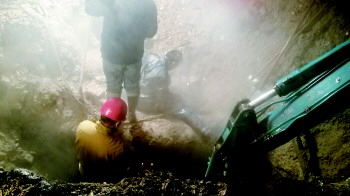 在抢修现场,抢修人员用挖掘机挖开路面,然后安排工作人员下到泥坑中查找管道漏点。由于一直下着雨,给抢修工作增加了很大难度。现场工作人员表示,将会连夜进行抢修工作,直至管网恢复正常为止。