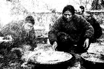 烙煎饼是苦活,鏊子低,得盘着腿坐在麦秸编的蒲团上,家口多的,一烙就是一天。当中吃口饭喝瓢水,得有人替换。往往一天下来,手酸、腿麻,站都站不起来了。鏊子下面四周通开,烟熏火燎,常常眼泪汪汪的。冬天还好说,三伏天坐在鏊子旁,滋味可想而知。