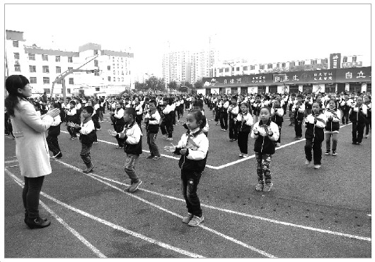 近日,淄博市教育部门到莱芜市第二实验小学参观少先队工作,并现场观摩了该校少先队特色活动。据介绍,该校少先队共有2214名少先队员,不仅推出了文艺演出、作品展览、“祖国颂”合唱比赛、诗歌朗诵等活动,还在阳光体育方面推广了诗歌版广播体操活动。图为:莱芜二实小学生正在做学校自编的诗歌体操。