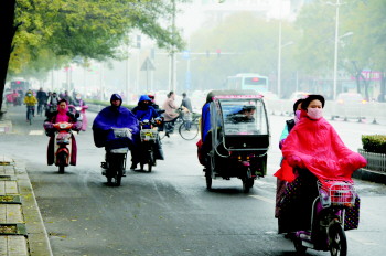 27日,淄博市下起小雨,不少市民穿戴雨具骑车出行。 本报记者 姜文洁 摄