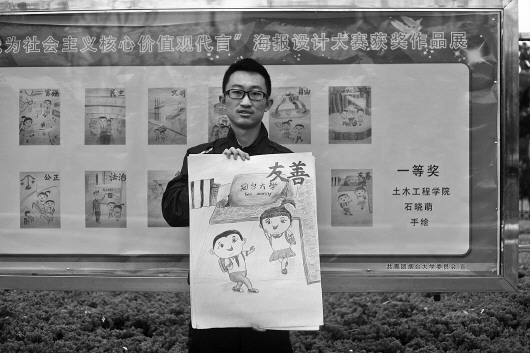 本报烟台11月29日讯(记者 陈莹) 烟台大学19岁的大二男生石晓萌,用他的画笔将“社会主义核心价值观”的12个核心词手绘成了12幅画。又正又萌的画让他夺得烟台大学“我为‘社会主义核心价值观’代言”比赛的第一名。