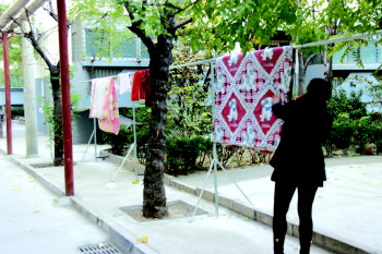 一位居民正在扑打晒在晾衣上的棉被。 本报记者 孟杰 摄