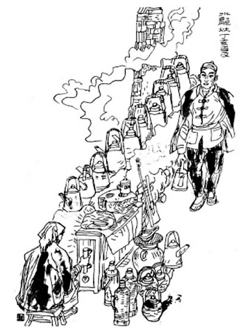 不过也不尽然,例外的是那些好饮茶的主儿,他们怕温吞水辜负了那茉莉花茶叶,就隔三岔五给水炉掌柜的送点小费,联络感情,密切关系。所以他们家里的无论大人小孩何时去买水,掌柜的都会附在你的耳边悄声低语:稍等会儿。随即打开炉门,捅旺炉火,待汽笛响过,给你的水壶或暖瓶里注满滚沸的水。那些好饮茶的主儿嘴刁,温吞水冲茶,他一品就辨出真假,可不是好糊弄的。吃了人家的手软,水炉掌柜的就提供周到完美的服务。时间长了,有些普通人家也摸到了规律,只要看见好喝茶的主儿家里有人去水炉买水,马上后脚跟上,也能买到一壶滚沸开水。