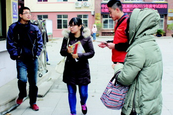 11月30日上午,在青岛21中考点,考生小李在朋友的陪伴下早早地在门口等候。小李今年从山东理工大学毕业,所学的矿物加工专业男生多女生少,很多单位招聘时特意备注只要男生,女生很难找到合适的工作。毕业后,小李回到临沂老家,在一家课外辅导机构当老师,因为对目前工作不是很满意,一直在寻找机会换工作。