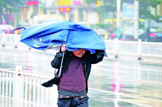 30日,在海港公园附近,市民冒风雨出行。威海市气象台于11月30日17时继续发布寒潮蓝色和大风黄色预警信号,12月1日,多云间阴有中雪,北风5~6级逐渐增强到7级,阵风8~9级,温度-1℃~7℃,请出行市民注意防范。