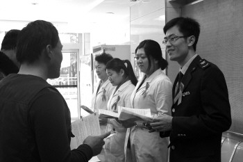 1日早上,济宁出入境检验检疫局保健中心的工作人员戴上红丝带,为准备出国劳务的人员做体检,对于艾滋病主题宣传活动,大都好奇地看看。