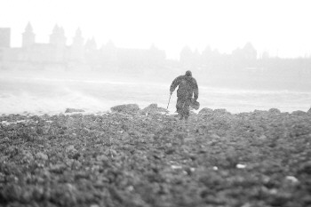 1日上午,第二海水浴场附近,有赶海经验的市民正冒着风雪捡海蛎子。