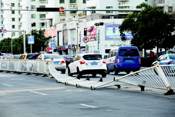 据市民田女士介绍,早晨9点左右,她开车沿华仁立交桥从南向北下桥时,前面的车突然向右侧变道,“下桥跑了四五百米,才发现是福州北路上有两处护栏倒了,占了最内侧的半个车道。”田女士称,下桥时车速很快,行驶在最内侧车道的车辆为躲护栏突然向右侧变道,导致第二趟车道的车辆也都往外变道,“太危险了!”途经南京路上班的市民刘先生也有同样的遭遇。刘先生介绍,南京路从闽江路到香港中路路段,不足一公里的距离就有四五处护栏倒伏,”本来早高峰就堵车,护栏一倒,上班路更堵了。”
