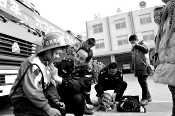 图为丁明云、许涛等小朋友在日照港公安局消防支队消防干警的指导下,试穿消防服。