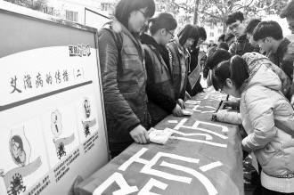 12月1日是第27个“世界艾滋病日”,为宣传普及艾滋病防治知识,威海市疾控中心工作人员走大学校园举行艾滋病防治宣传,图为哈工大(威海)学生在“防艾”宣传条幅上签名。