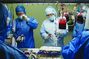 工作人员将细胞保护剂注入脐血袋。 本报记者 王鑫 摄
