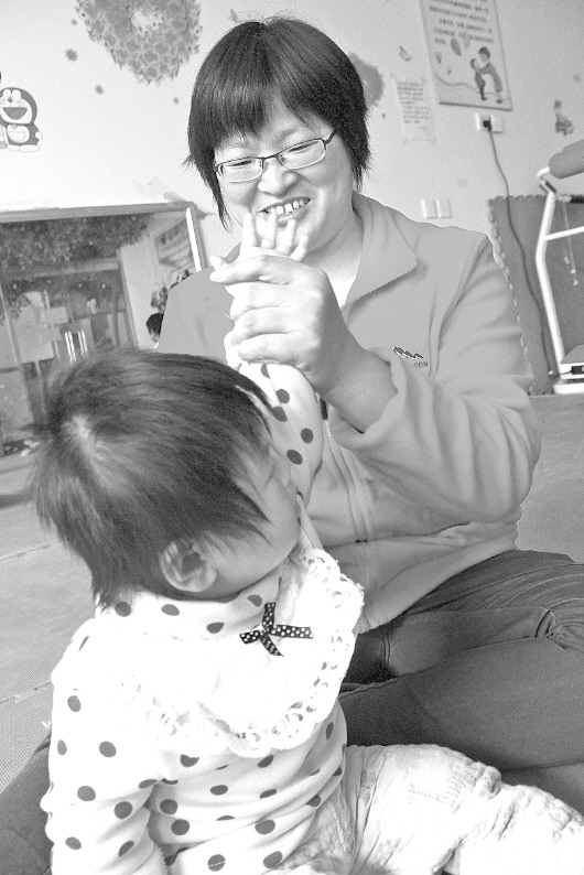 ◤侯立霞在康复中心给孩子做按摩。 本报记者 李军 摄