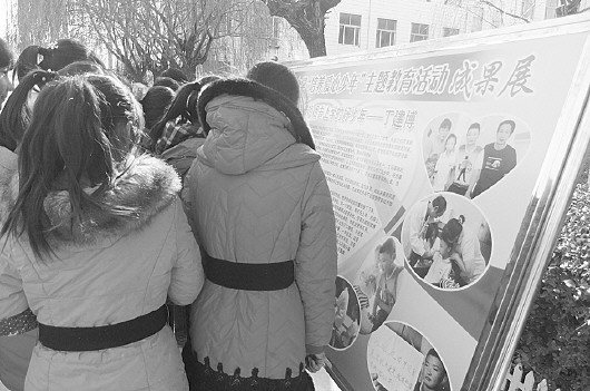 丁建博所在中学做展板对他的事迹进行宣传。 本报记者 赵念东 摄