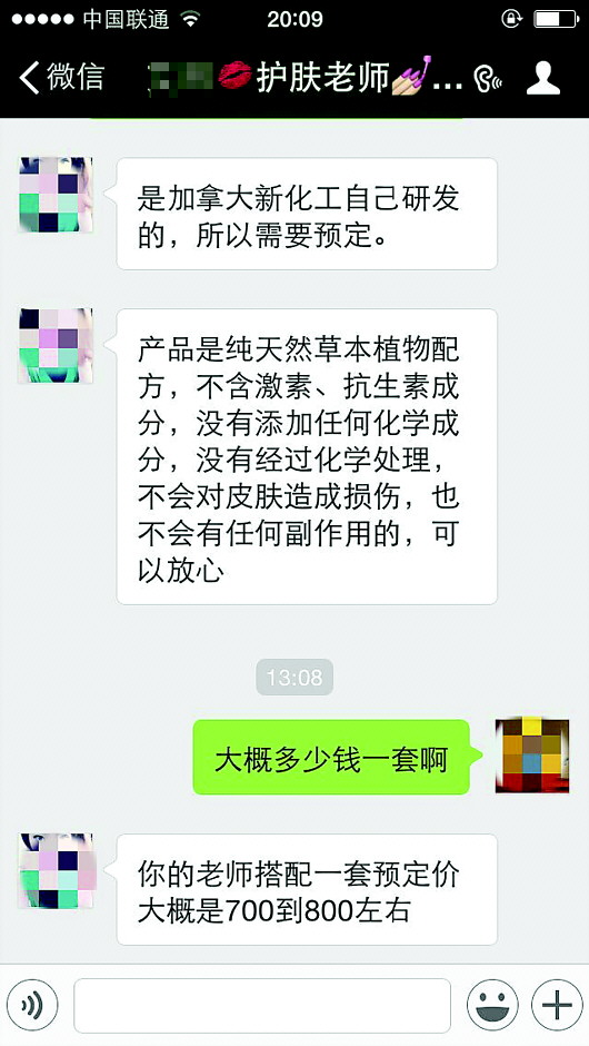 12月1日,记者联系了“护肤老师”,据其介绍,她们的日常工作是培训和讲课,业余时间帮女性分析解决肌肤问题。“每天为有肌肤问题的人搭配五套产品,有名额限制。”在咨询了记者的皮肤问题后,“老师”给记者介绍的产品,或为“某国外工厂自己研发”或为“国内某博士研发”的产品,价值为每套700-800元。
