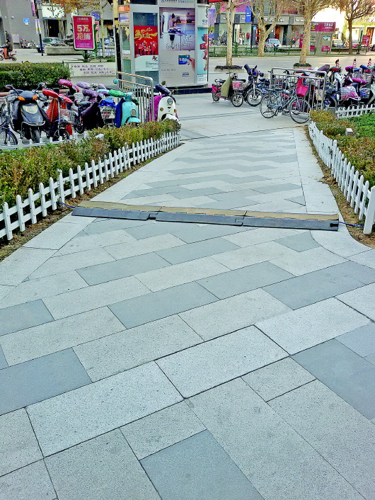 ▲某商场门前的坡道设计不符合无障碍设施建设标准。