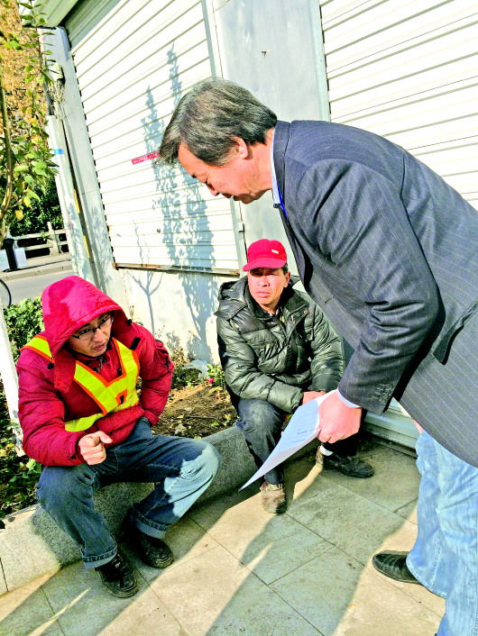 石国华向环卫工询问一名流浪人员的下落。