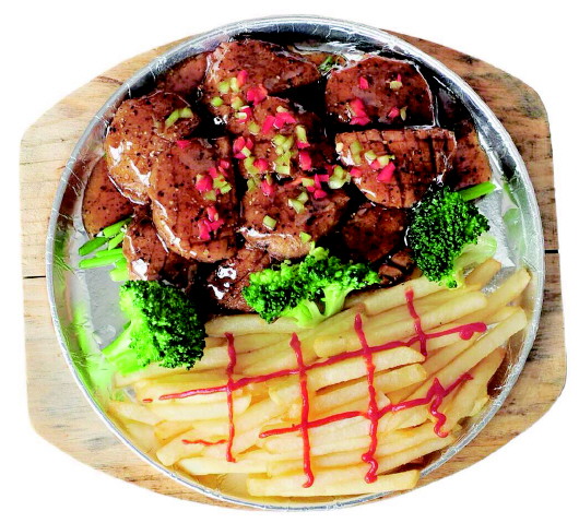 ◤铁板牛排仿荤菜看起来和真牛排相差无几。