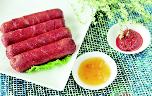 ▲看似香肠的素肠是不少素食店里最受欢迎的菜品之一。 朵朵开素食店供图
