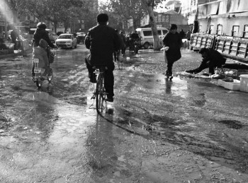 2日上午9点,记者来到交运市场东首,健康路上的冰刚开始融化,20余米的路面泥冰参半,过往人流量很大,行人减慢脚步、车辆减速慢行。该处西接交运市场鱼市区、南依铁塔商场、北临三中,人流量、车流量都比较集中。