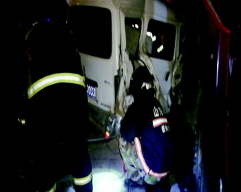 11月30日18时许,禹城市迎宾路北段两车相撞,面包车车头钻进一辆罐车的中间部位,面包车内有一人被困。消防队员半小时将男子安全救出。