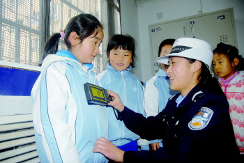 12月2日,金海岸小学的学生在交警直属大队办案区体验。