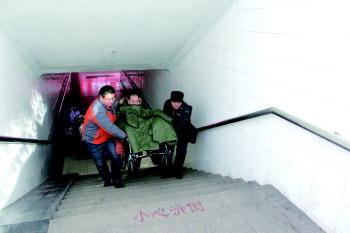 救助站工作人员为阿水盖上大衣抬到站台上。