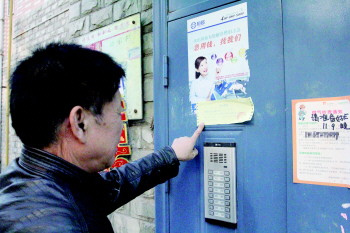 居民正在看自来水公司贴在小区单元门上的停水通知。 实习生 李洋 摄