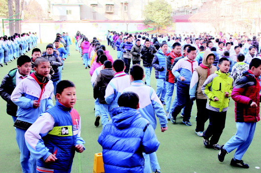 据了解,位居市区的经十一路小学全校学生近1900人,但操场面积不足1千平方米,人均不足1平方米。以前班班相连,四列纵队在操场上跑步,根本跑不起来,学生活动量难以达到。如今由四列纵队改成一列纵队,以班级为单位,齐头并进环形跑,10分钟时间,每名学生能跑1000-1500米,活动量比以往大了很多。