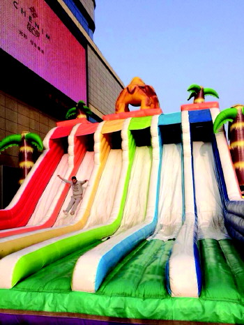 快乐大闯关是近年来流行的一种大型户外竞技娱乐互动类活动,一条充气式气垫赛道总长80米,共设有飞檐走壁、能屈能伸、不进则退、翻山越岭等8个关卡,一次能通过6个孩子或者4个大人,融趣味性、挑战性、互动性于一体,具有关卡最多、赛道最长、安全系数最高、趣味性最强等特点。