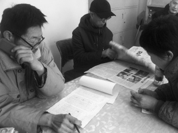 梁杰(左一)正在和业主核对电费。 本报记者 张召旭 摄