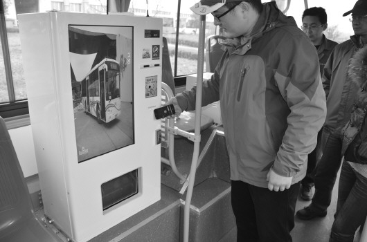 4日,在青岛公交集团申沃客车公司,一辆新采购的纯电动公交车驾驶室后方四人座处增加了一位“新成员”,这就是车载饮料自动售货机。该车载饮料自动售货机外观是一个白色的长方体箱子,高1米多,宽约60厘米、厚约40厘米,几乎等同一个座位的位置,同时箱体正面配有一块27英寸电子显示屏。