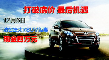 众所周知,纳智捷不优惠,此次机遇必然是极其珍贵,购得爱车的同时,为您省下4万元,省的就是赚的。省钱才是硬道理。那么这样的钜惠政策不是无限期供应的,本月6日,纳智捷大7SUV将为您呈现上述钜惠政策,不限时间,仅限车辆台数,毕竟主机厂给出的直销车型是有限的。活动日主机厂区域总监现场签售,最后机遇,稍纵即逝,抓住就是4万元哦。