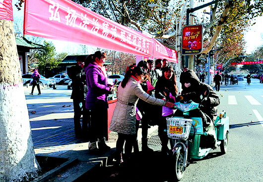4日,在章丘市汇泉路百脉泉广场,32个具有执法普法职能的市直部门及相关单位联合开展了上街宣传活动,向市民普法解疑。图为工作人员向市民分发法律宣传资料。