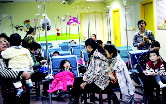 ◥近期天气突变,感冒的患者急剧增多。在山东省千佛山医院儿童输液室内,家长们正在陪伴患儿打吊瓶。