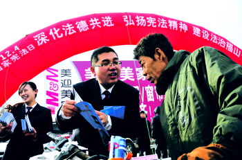 12月4日上午,福山区检察院、司法局等多部门在福山大集联合开展首个国家宪法日宣传活动。活动现场向市民集中开展法律咨询,讲解宪法知识,并发放宪法宣传册、法律知识彩页等各类宣传资料。