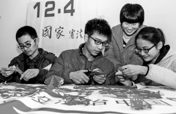 聊城大学环境与规划学院开展“大学生剪纸喜迎国家宪法日”活动。大学生剪纸爱好者在享受剪纸艺术快乐的同时,感悟宪法精神,增强法治观念,喜庆12月4日我国首个“国家宪法日”的到来。