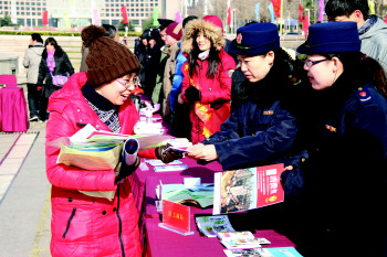 4日,市南区工商局执法人员在五四广场向群众讲解《新消法》,并发放宣传材料。