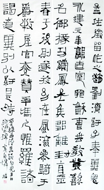 李樯很有才情,这一点在他的文章中随处感到,他能够把枯燥的考据类文章,写得让人心跳。反映在他的字中,也流露出他那份独有的创造天性,他的敏锐洋溢出生命的情趣和睿智的快感。不少人为了追求隶书的古拙,把隶书写得呆头呆脑,而他在古拙中流露出风流与浪漫,使得隶书生动活泼、充满稚气,这一点非常可贵!