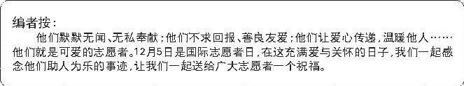 他们默默无闻、无私奉献;他们不求回报、善良友爱;他们让爱心传递,温暖他人……他们就是可爱的志愿者。12月5日是国际志愿者日,在这充满爱与关怀的日子,我们一起感念他们助人为乐的事迹,让我们一起送给广大志愿者一个祝福。
