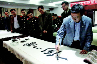 4日,威海市文联携手市书法家协会开展“文艺志愿者深入警营服务采风”活动。近20位书画艺术家为市边防检查站的官兵挥毫泼墨,创作了百余幅书画作品。 本报记者 陈乃彰 摄影报道