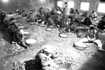 在莱州市海庙港扇贝养殖公司割丁棚内,近40名割丁工人在紧张忙碌着,因为工资是按照割出扇贝丁的斤数计算,所以每名工人前面都有一个盛着扇贝丁的大盆。