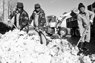 8日,市区的环卫工人正在清扫积雪。日前,市区普遍降雪,为了防止路面结冰,确保交通畅通,环卫工分散在城市的各个道路,冒着严寒为车辆和行人清出安全通道。