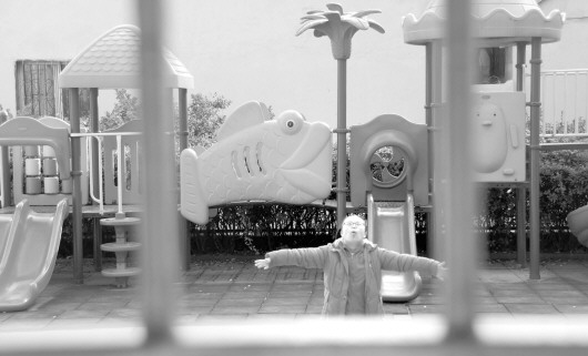 烟台市芝罘区辅读学校,一个残障小孩在院子里玩耍。